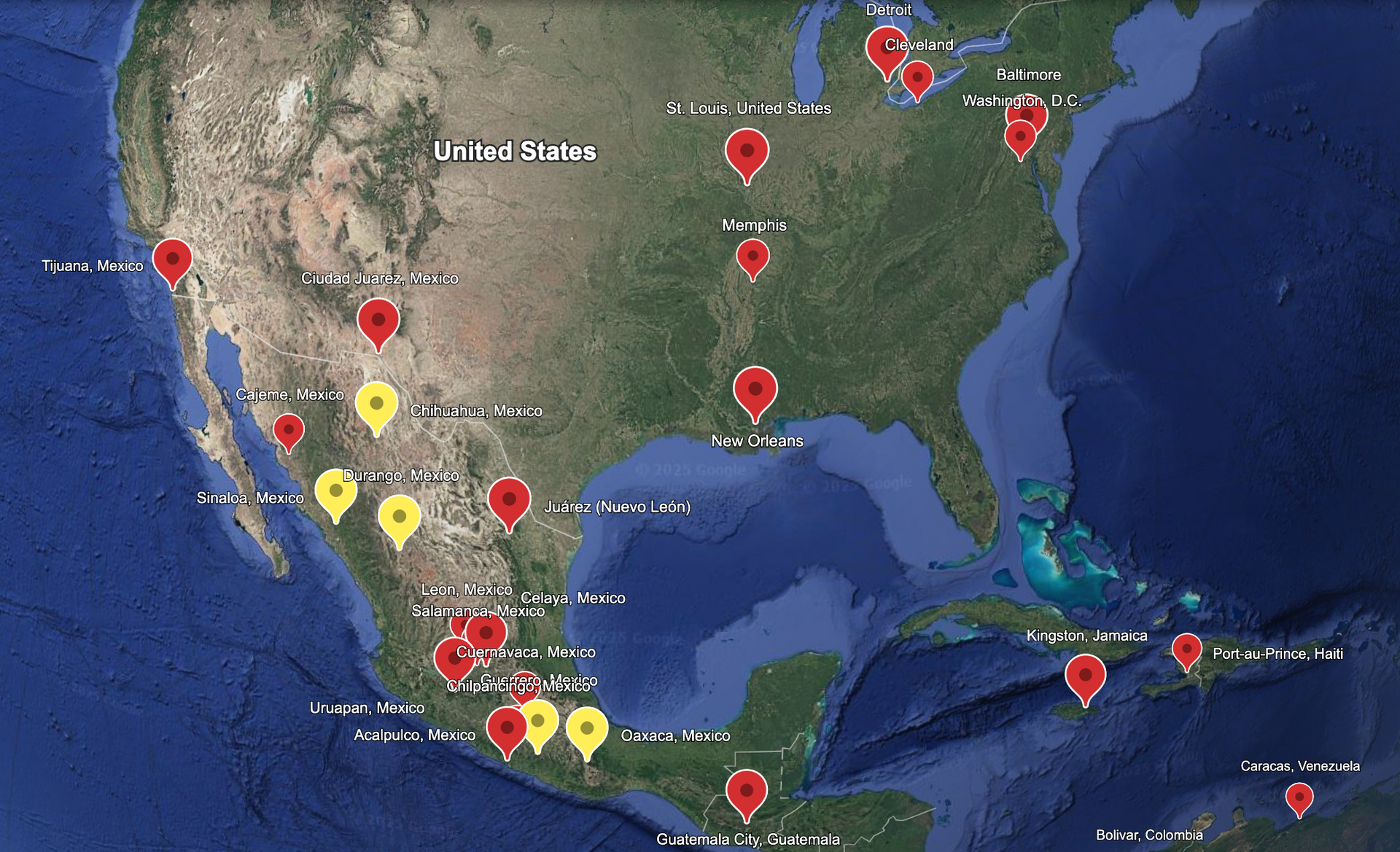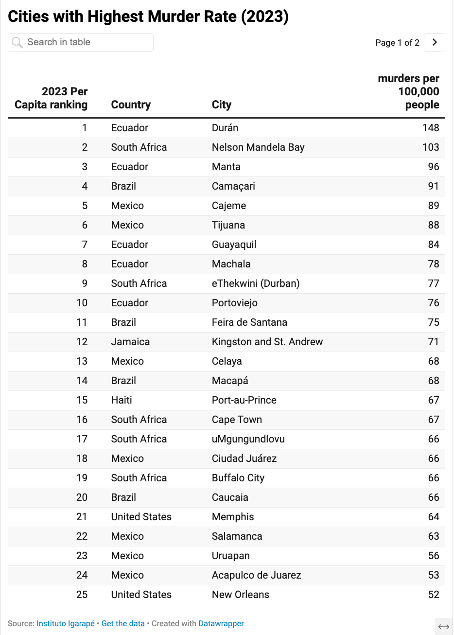 The macro-level view of this violence on a country-by-country basis is convincing. Diving into the details at a more granular level is even more alarming. Some countries have multiple cities within the top 50 highest murder rates:
