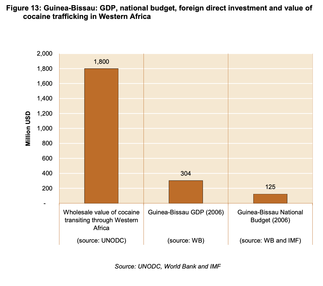 Guinea-Bissau was labeled by the United Nations as Africa’s first “narco state” in 2008. It was an accurate assessment. It was easy for cartels to corrupt officials in this West African nation, which at that time, had no prisons and the world’s fifth-lowest economic development. The UNODC once illustrated how the estimated wholesale value of illegal drugs flowing through West Africa dramatically exceeds Guinea-Bissau’s GDP.