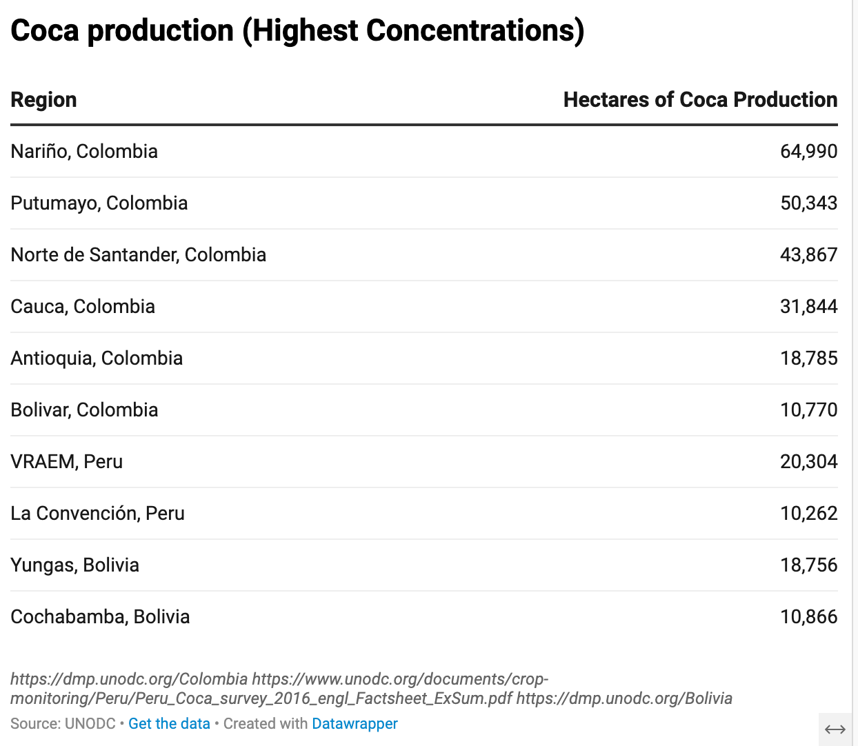 Unlike heroin, there’s only one region of the world (the Andean Region) for cocaine production. Criminal groups grow coca in Guatemala, Honduras, and Mexico, but it’s not potent enough to be economically viable for export. Nearly all of the world’s cocaine is produced in just three countries: