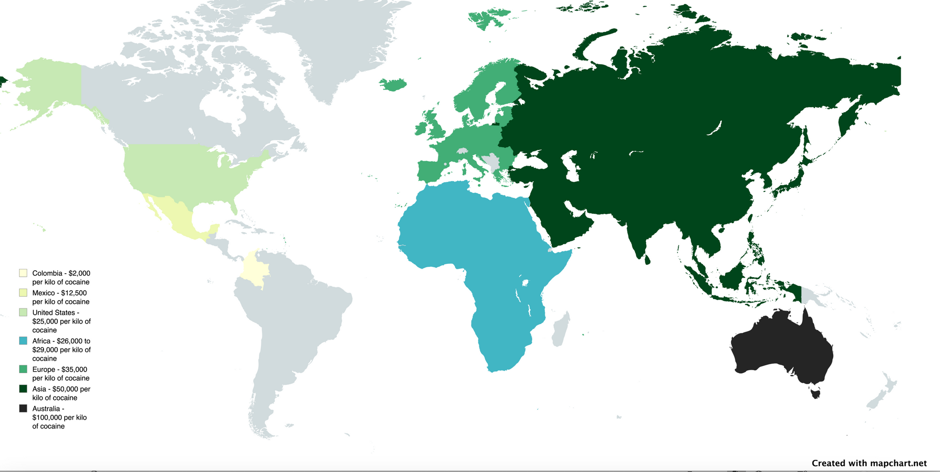 The following map illustrates how proximity factors significantly into the pricing of cocaine.